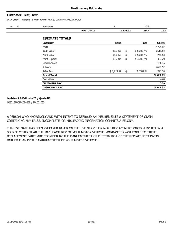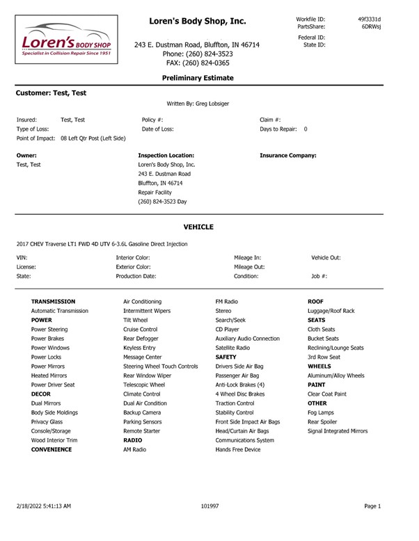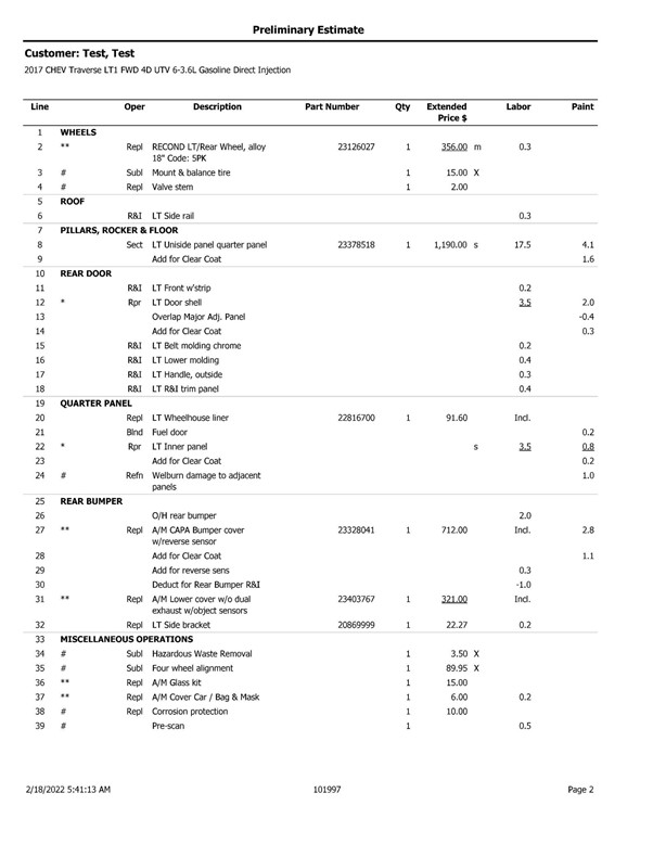 We are going to take an example quarter panel replacement on a 2017 Chevy Traverse (see my photos). The car has some repairable damage to the LR door, needs the LR quarter replaced, damage to the LR wheelhouse, damage to the LR wheel, needs the upper and lower rear cover replacement. Not too complex, right?